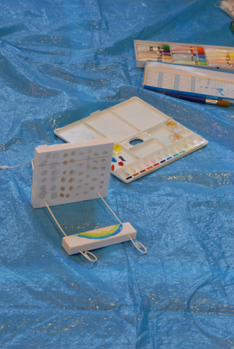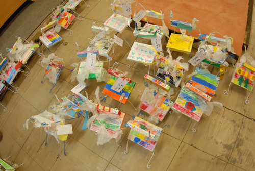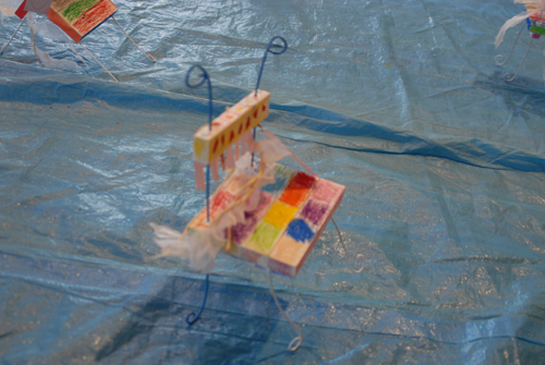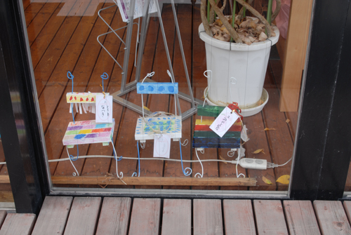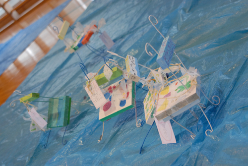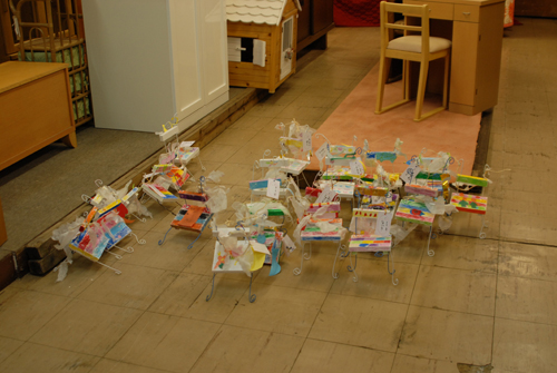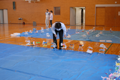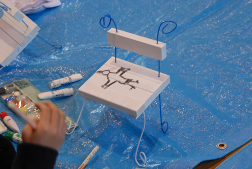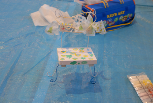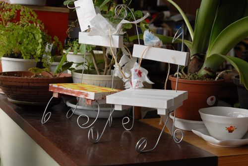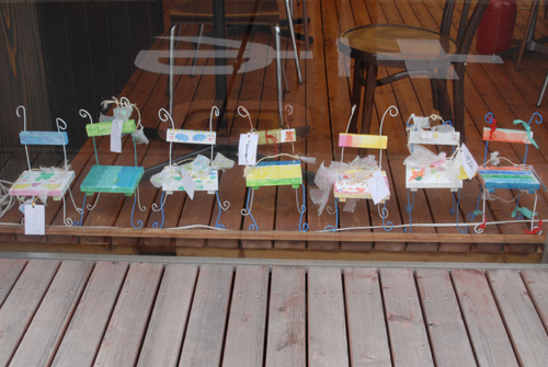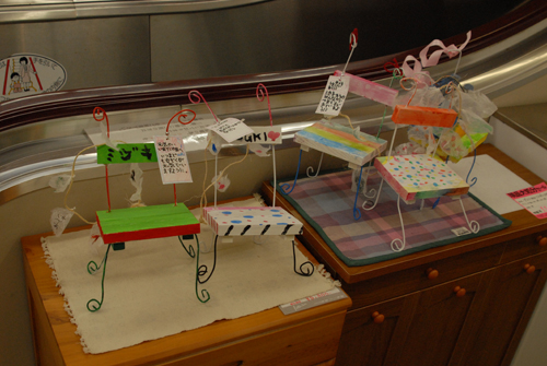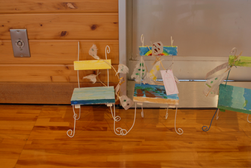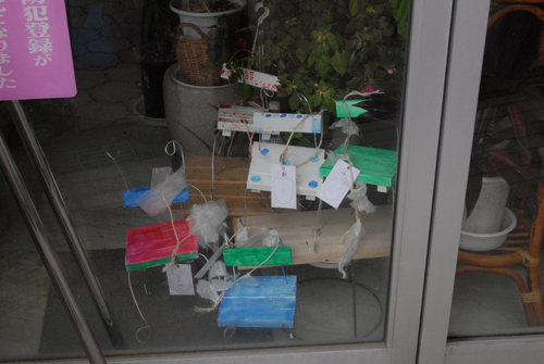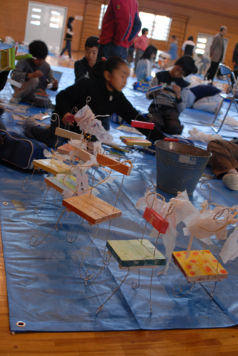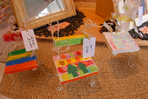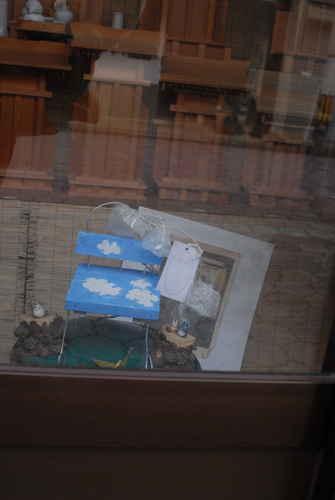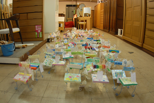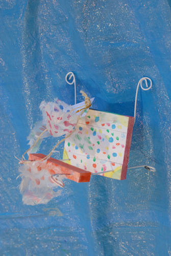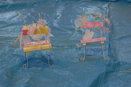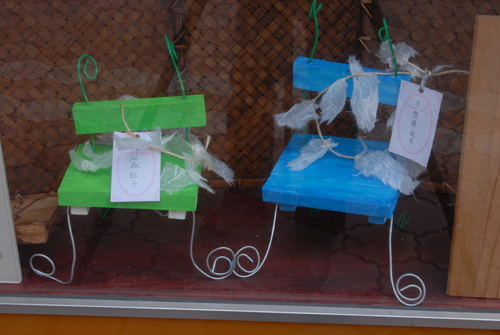 (天使が降りてきて休息する椅子を作る。自宅に置く時は、玄関先に置き、椅子には、天使が次に行って欲しい場所:〇〇〇 & 何をしてあげて欲しいか:〇〇〇などと、メッセージを書いたタグをつける。)2007年 素材:木・因州和紙・ミクストメディア