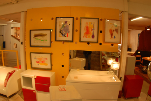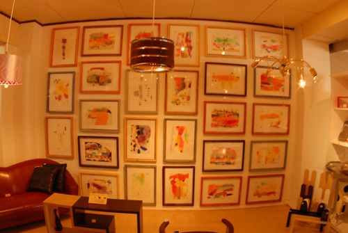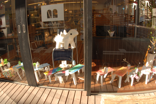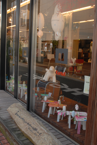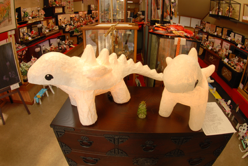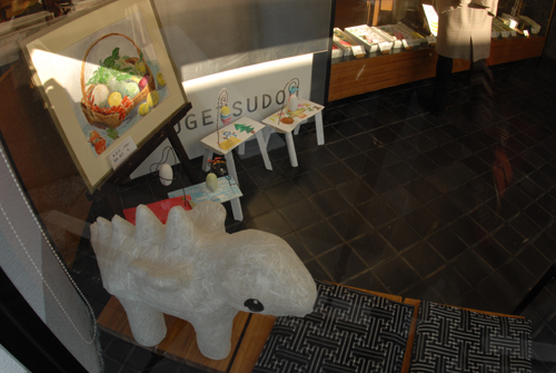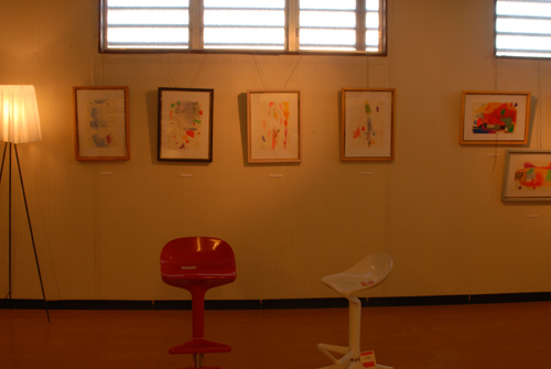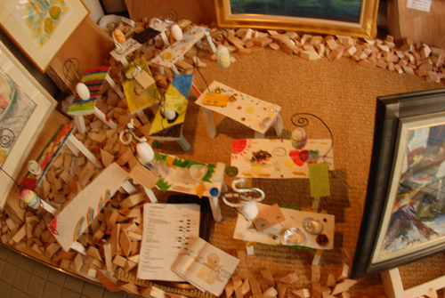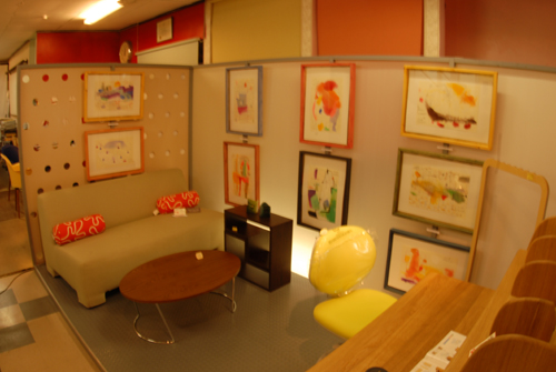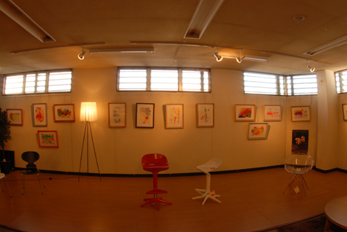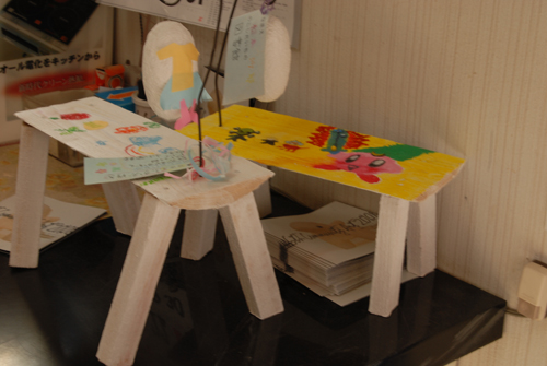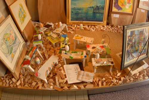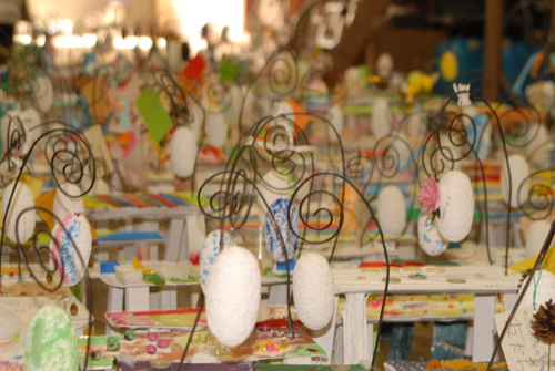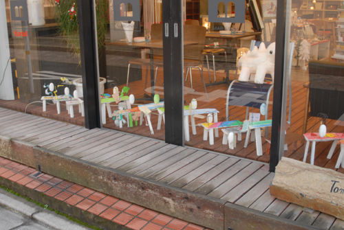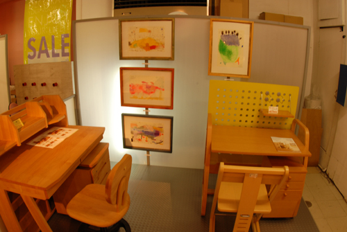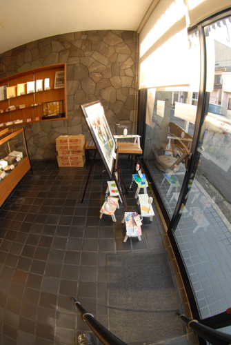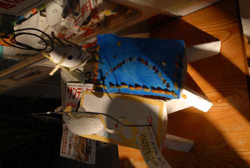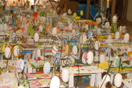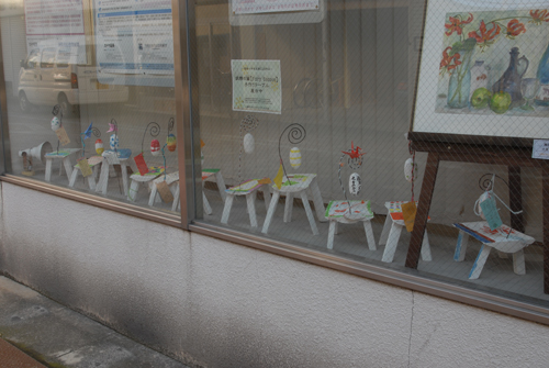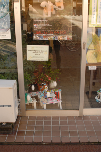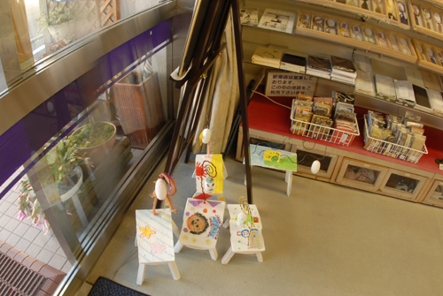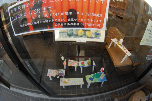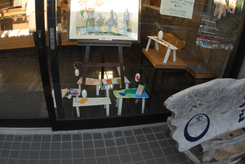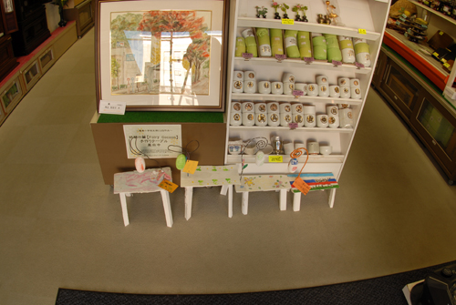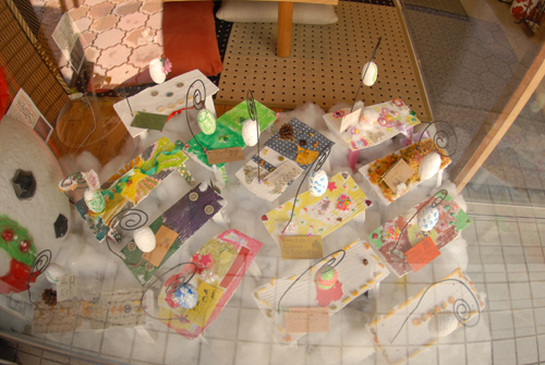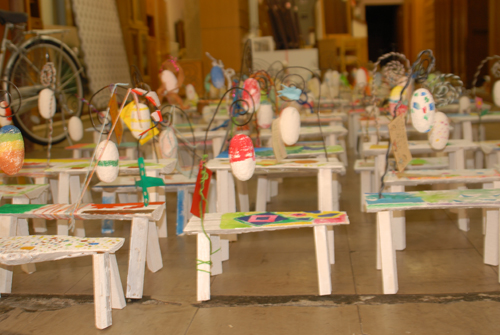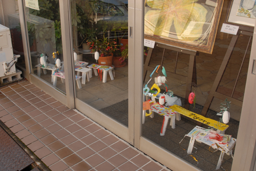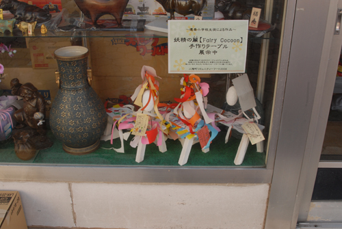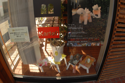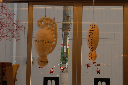妖精の繭 & オイルパステル絵画 「 二階町コミュニティーART 2008年 」 (10000年未来から届けられた妖精の繭を手にして机に飾る、未来から届けられたっ妖精の繭を見ながら、何を未来に残したいかメッセージカードに書いて机にタグ付けする。小学校の体育館で制作完成した妖精の机は、12月〜クリスマスの期間中、二階町商店街の各店舗のウインドーに飾られる。期間中は、子供たちとそのご家族が飾られた妖精の机を見ていただけるよう灯りをつけ、また人通りも賑やかになるように。 遷喬小学校全校生徒によるワークショップ 2008 年 妖精の繭=マユ石膏 & パステル絵画 中性紙