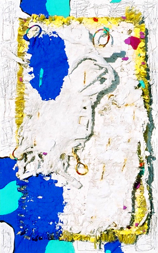 絨毯の上に寝ころぶ牛と牛にもたれて昼寝をする天使 2004 -