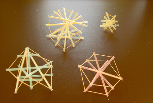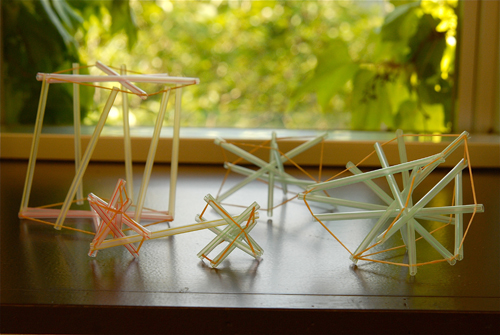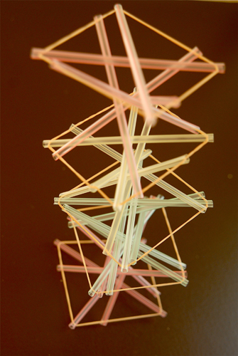 ”テンセグリティー”という言葉は”テンション=張力”という言葉と”インテグリティー=統合”という言葉から作られた造語であり、構造の統合の等級は、その構造内の張力のバランスによって決定づけられる、ということを意味する。宇宙に存在する全ての構造は、張力と圧、”押す力”と”引く力”のバランスによって支えられている。椅子が床の上に置いてある、ランプが天井から吊り下げられている、これらすべては、そこにある何かを支える方法である。